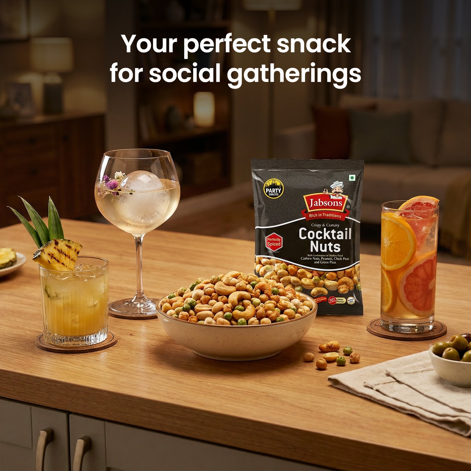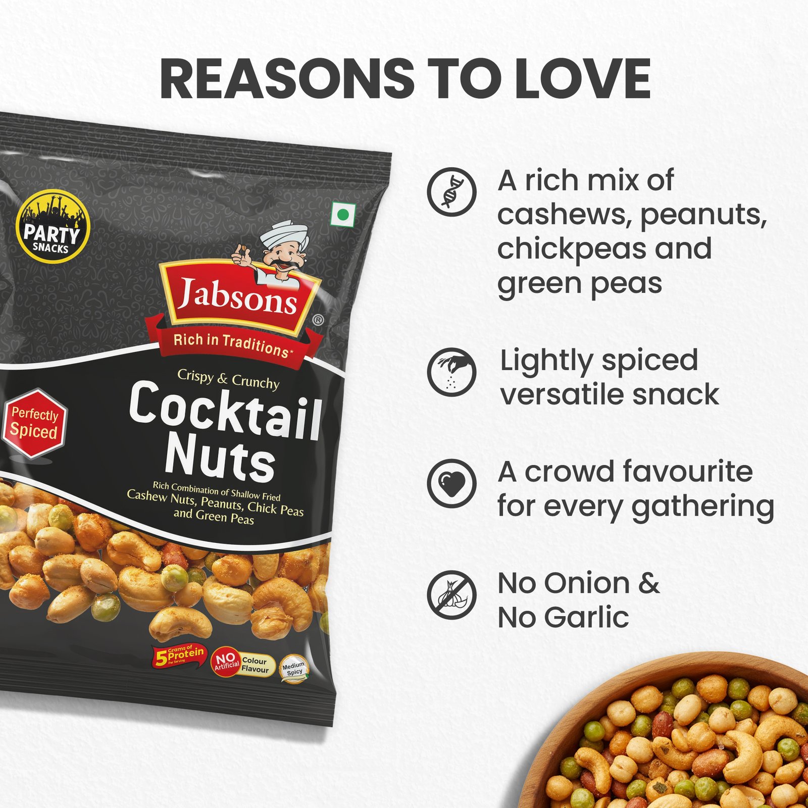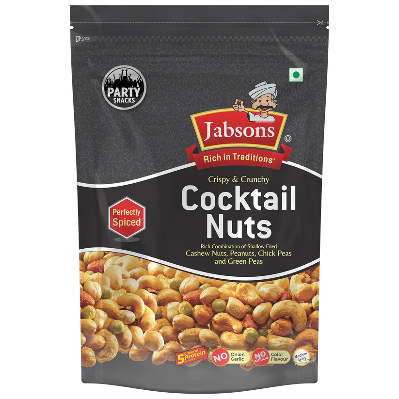 Cocktail Nuts are a crunchy, spicy mix of premium nuts, packed with 5g of protein per serving. A perfect party snack, these nuts are no onion, no garlic, making them a versatile treat for any occasion.
