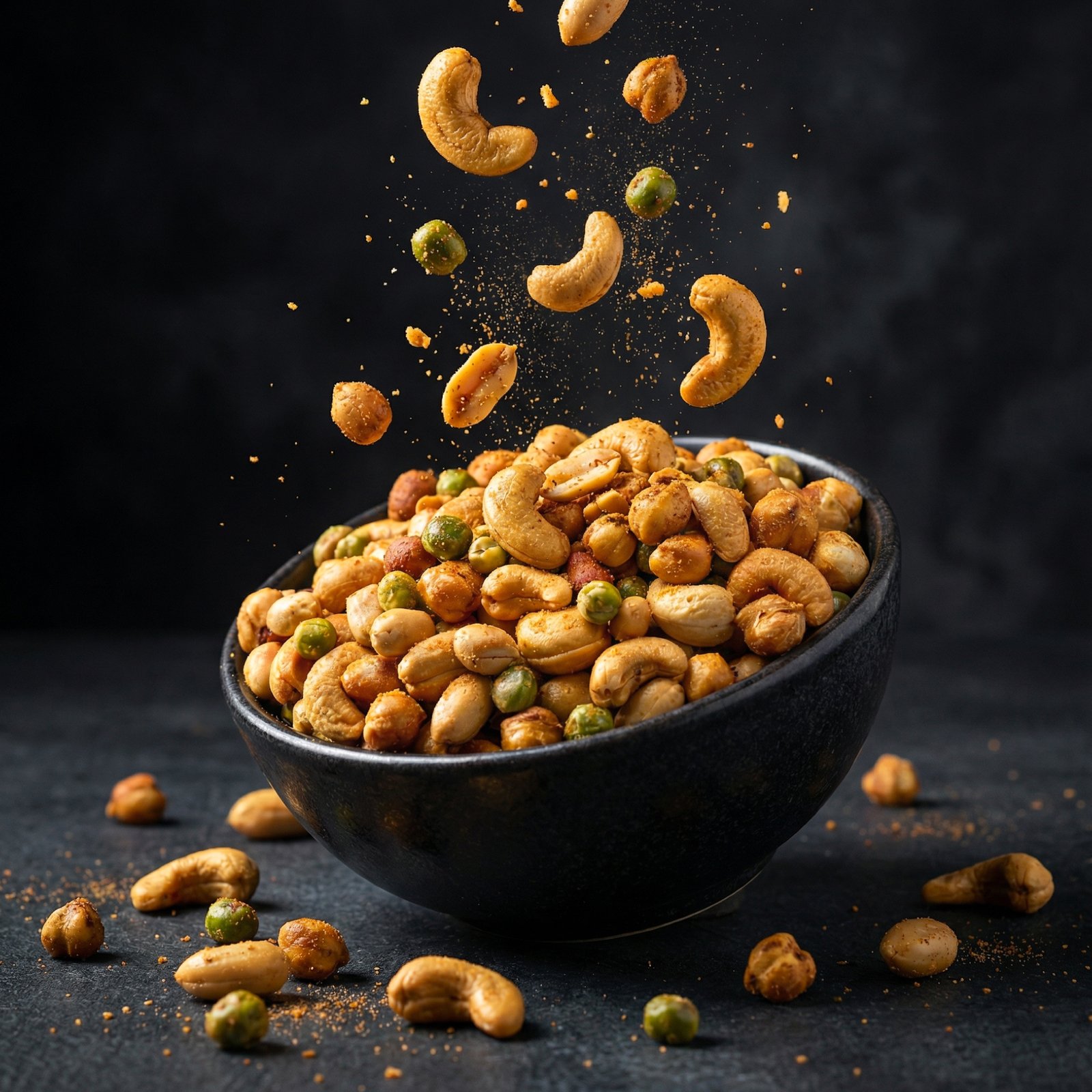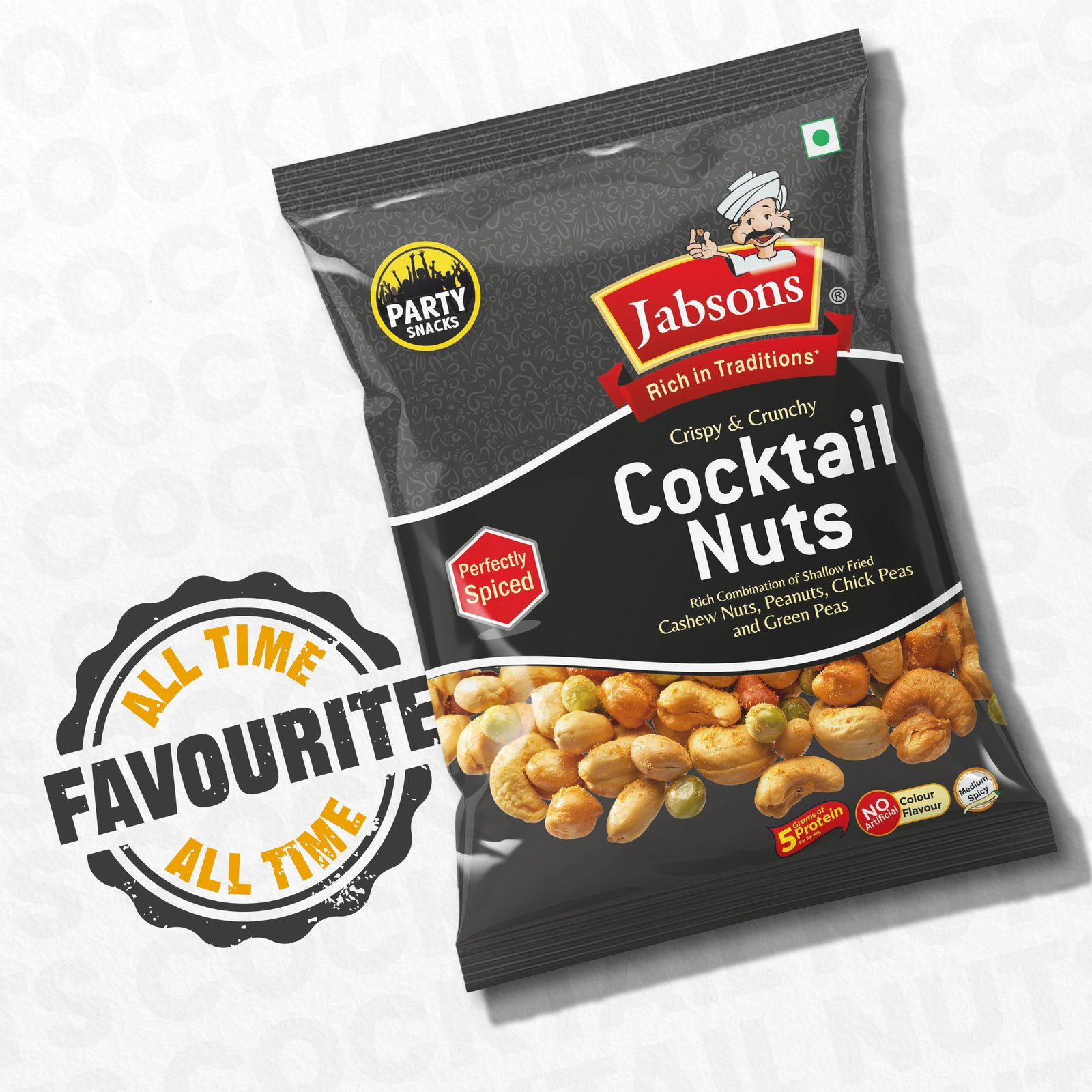 Ingredients: Peanuts (19%), Chickpeas (17%), Green Peas (17%), Cashewnuts (15%), Refined Palmolein Oil, Iodised Salt, Sugar, Spices & Condiments (Red Chilli, Black salt, Cumin, Dry Mango Powder, Lemon Powder, Turmeric, Mint Powder, Ginger, Cassia Leaf, Black Pepper, Fennel, Star Anise Coriander, Carom Seed, Green Chilli Flakes, Clove, Asafoetida) Acidity Regulator (Citric Acid, Malic Acid).