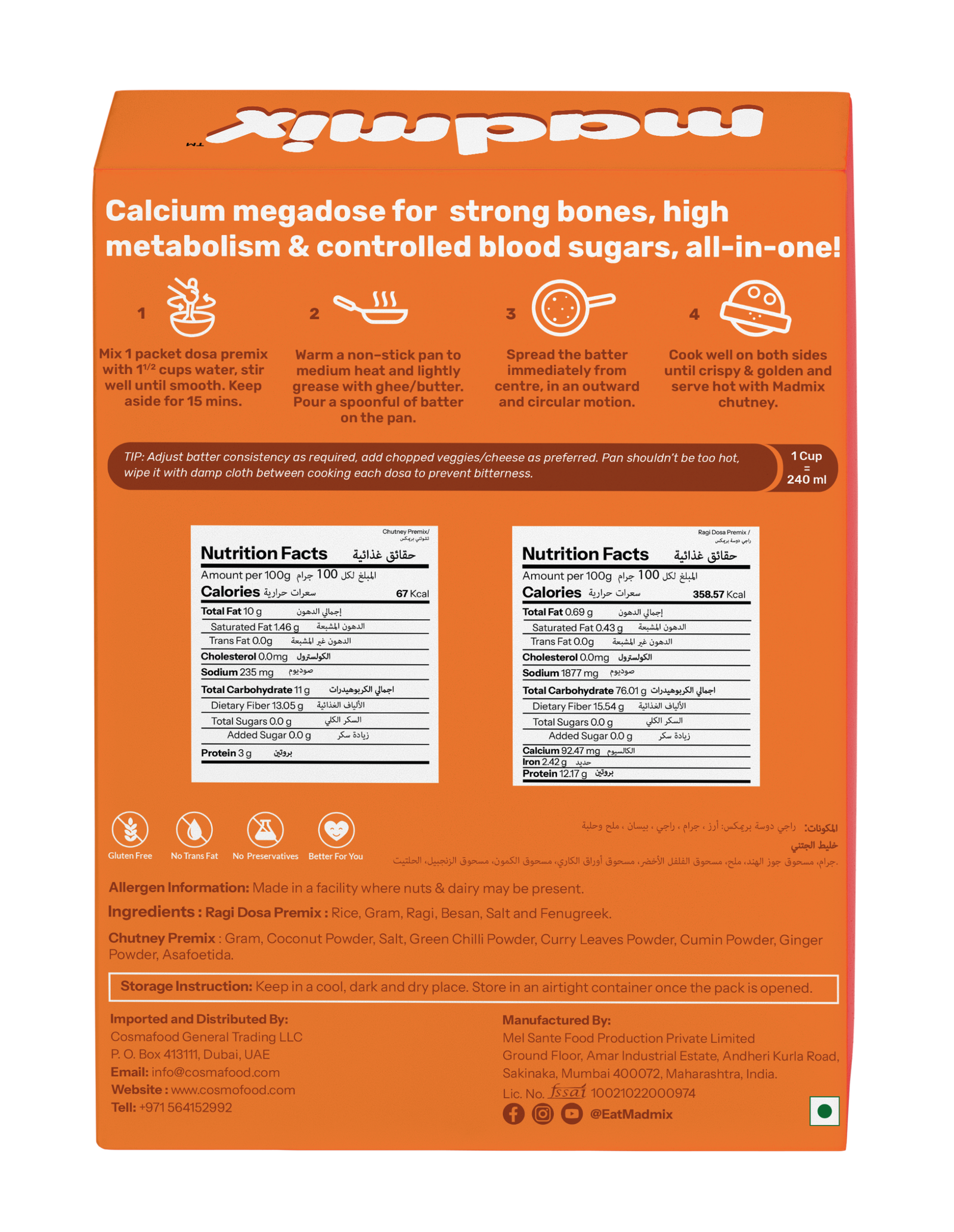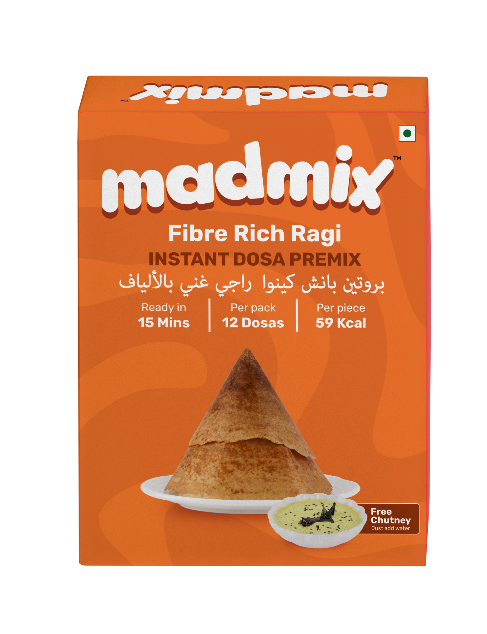Nourish your day with Madmix Fibre Rich Ragi Dosa Premix. Each premix serving contains high calcium content that boosts your metabolism. This 100% baked premix is perfect for having quick, healthy, fulfilling meals at any time of the day.