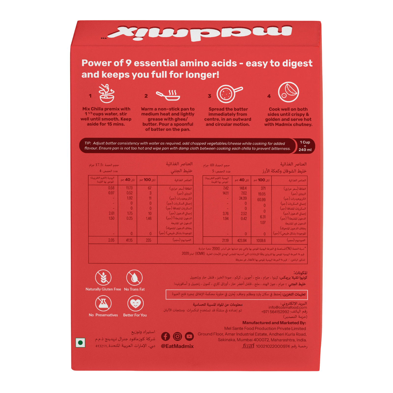 Madmix Protein Punch Quinoa Chilla Premix makes a delightful meal loaded with 9 essential amino acids which are beneficial for you. This 100% baked premix is crafted with fresh millets which gives you a burst of energy and rich flavours all together.