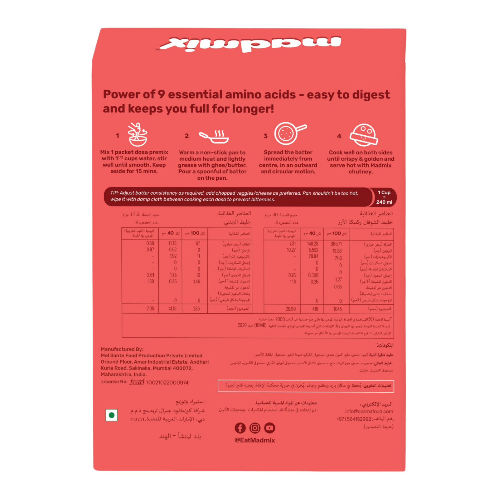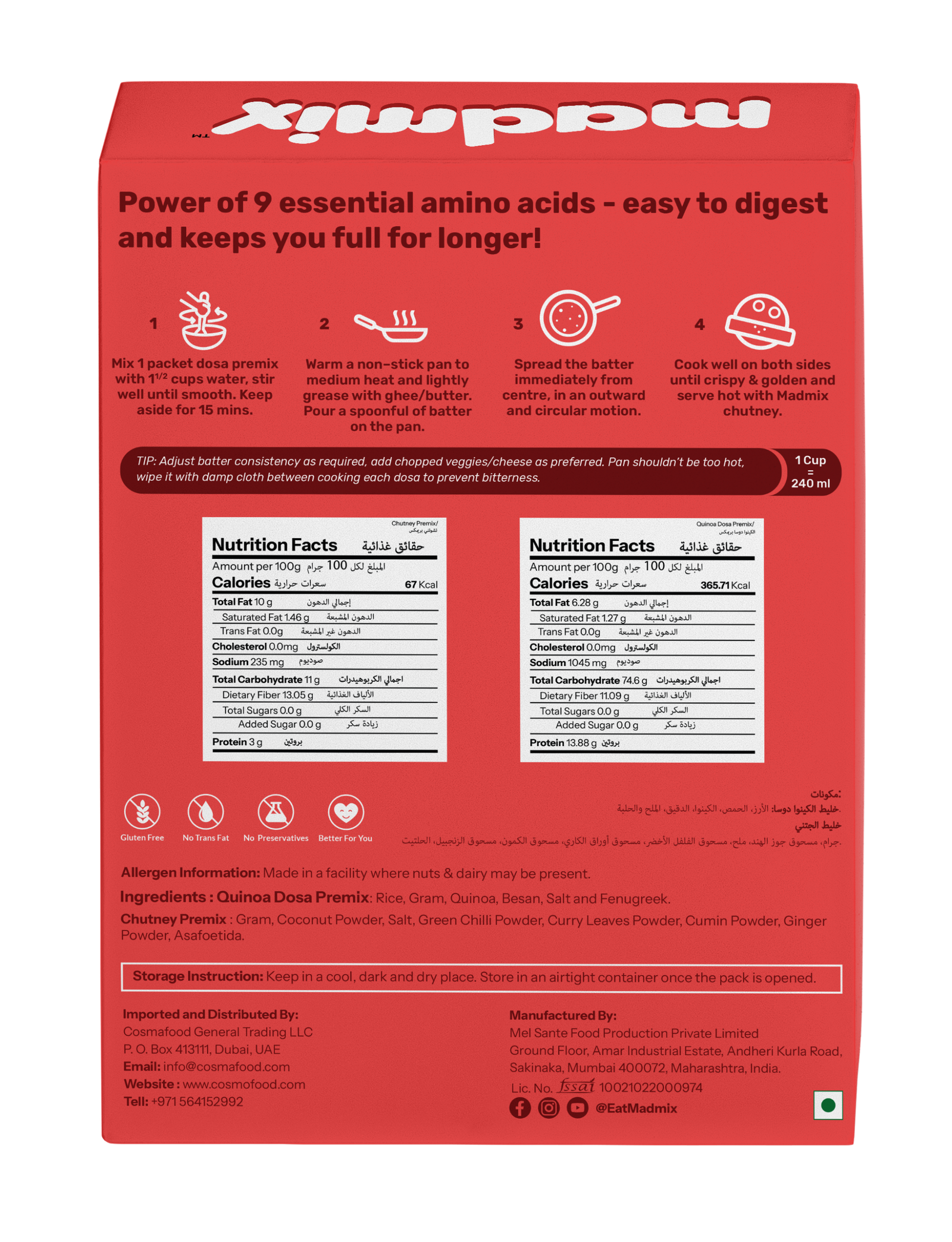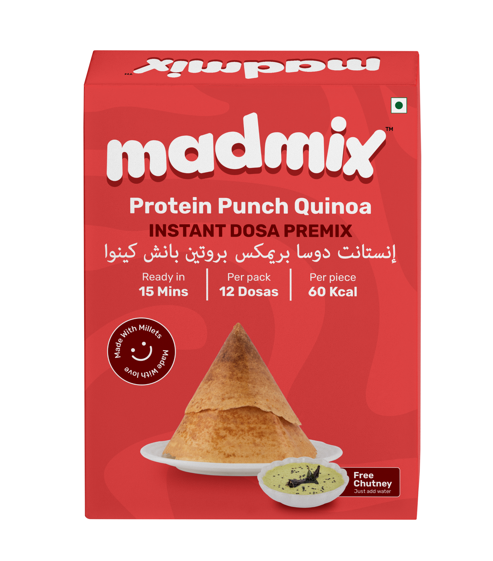 Madmix Protein Punch Quinoa Dosa Premix makes a quick, delightful & energetic meal. This premix is 100% baked, power-packed with nutrients & contains no added preservatives. It is the perfect effortless meal to satisfy your hunger on the go!